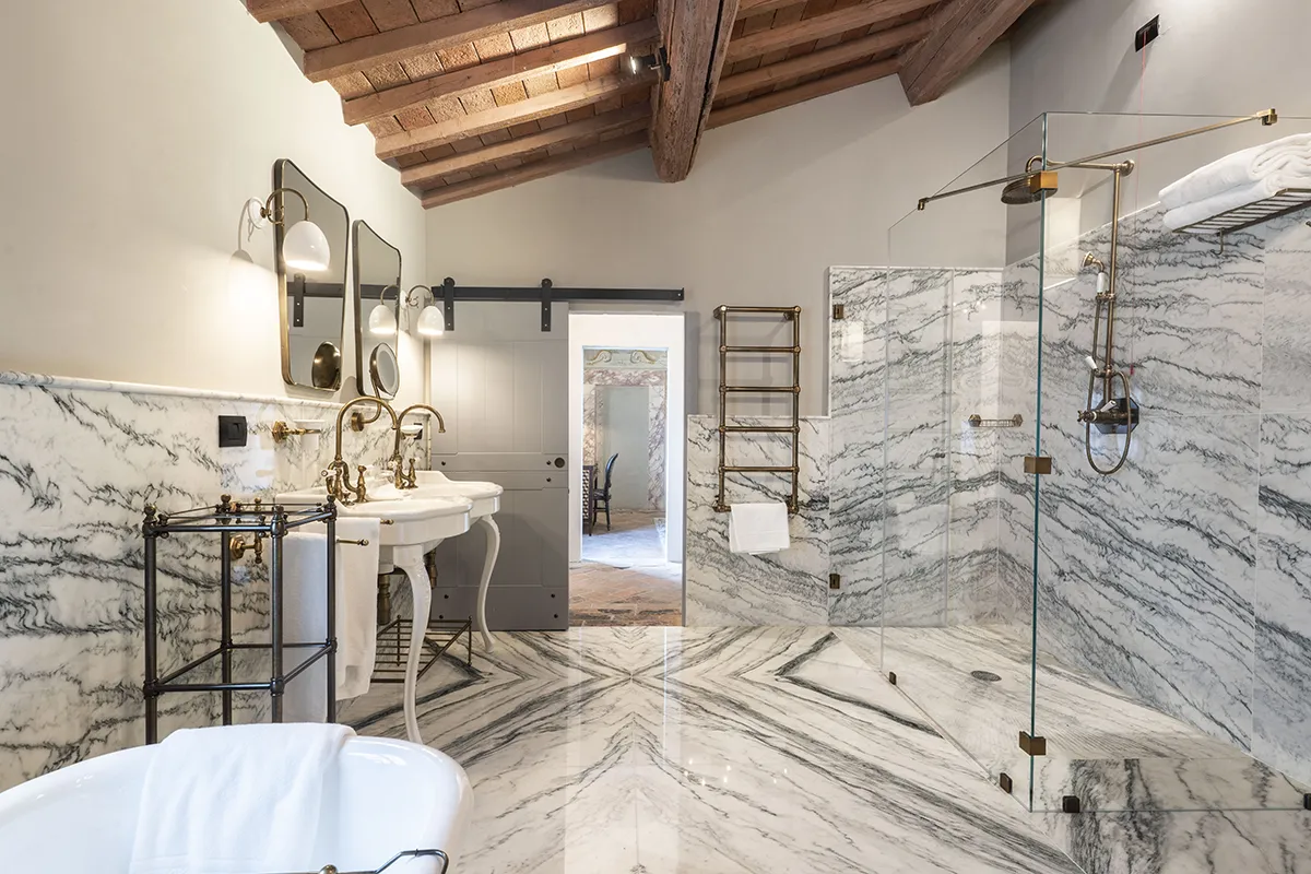 Master Suite “Alessandri” prende il nome dalla nobile famiglia Alessandri che possedette la villa per oltre 500 anni. È l’unica suite che conserva intatti e restaurati gli affreschi originali del XVII secolo sia nella sala principale che nella piccola cappella seicentesca situata in un soppalco sempre a disposizione della suite. La camera dispone inoltre di due ingressi privati: uno tramite ascensore dedicato situato al piano terra e l’altro da una piccola scala a chiocciola del XVI secolo adiacente alla reception.