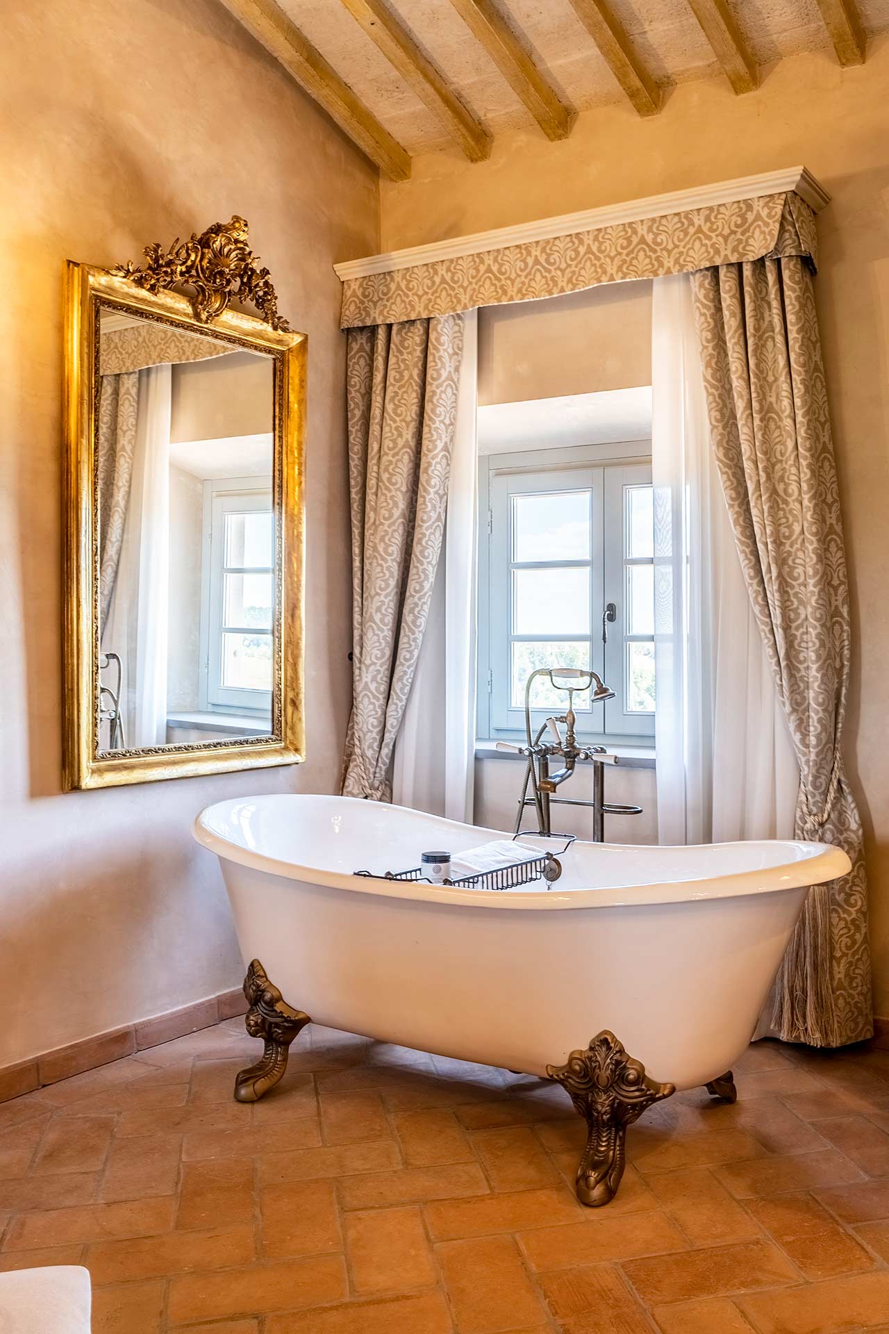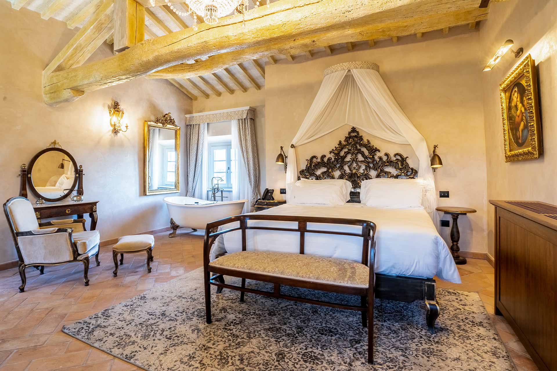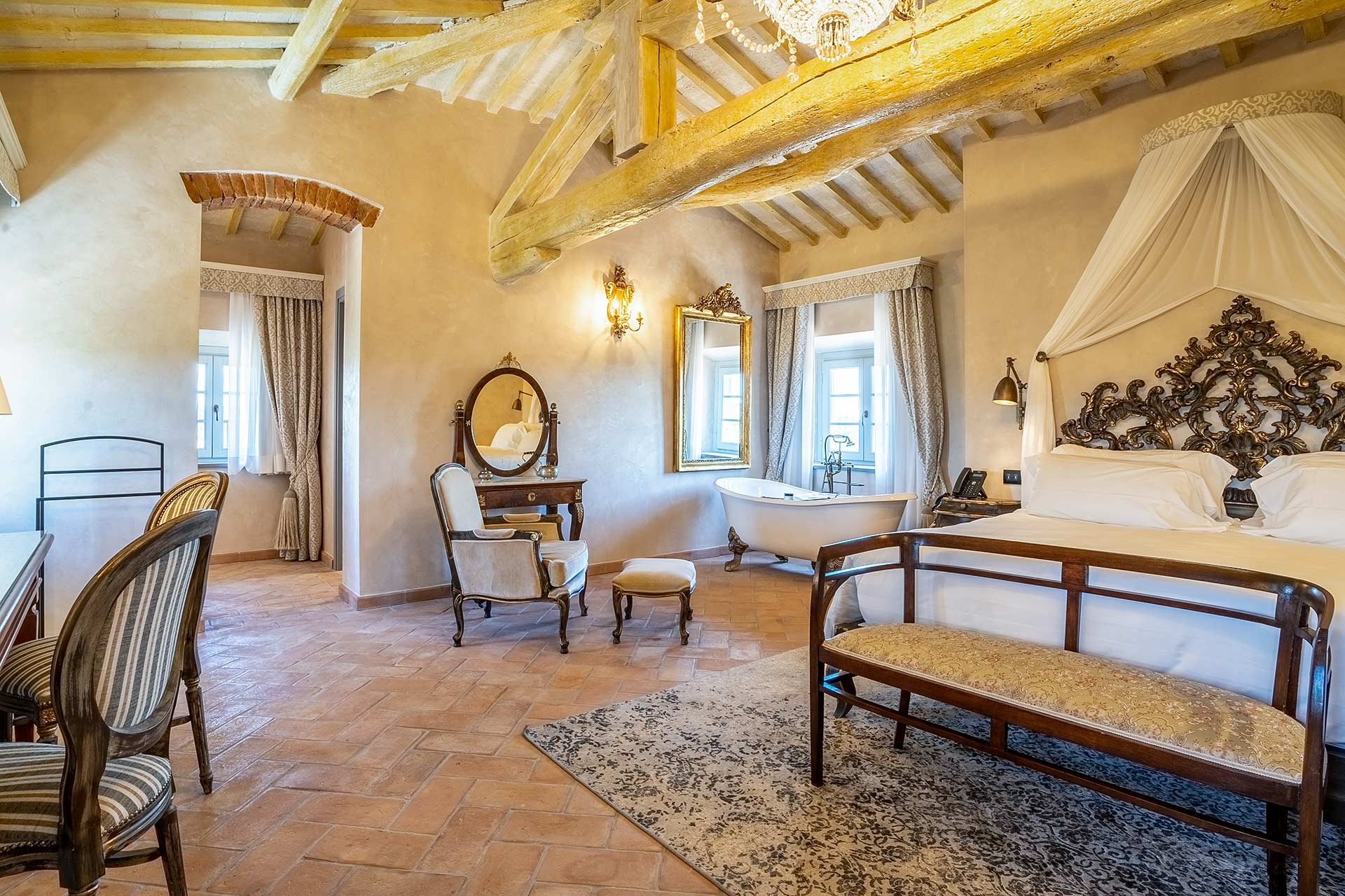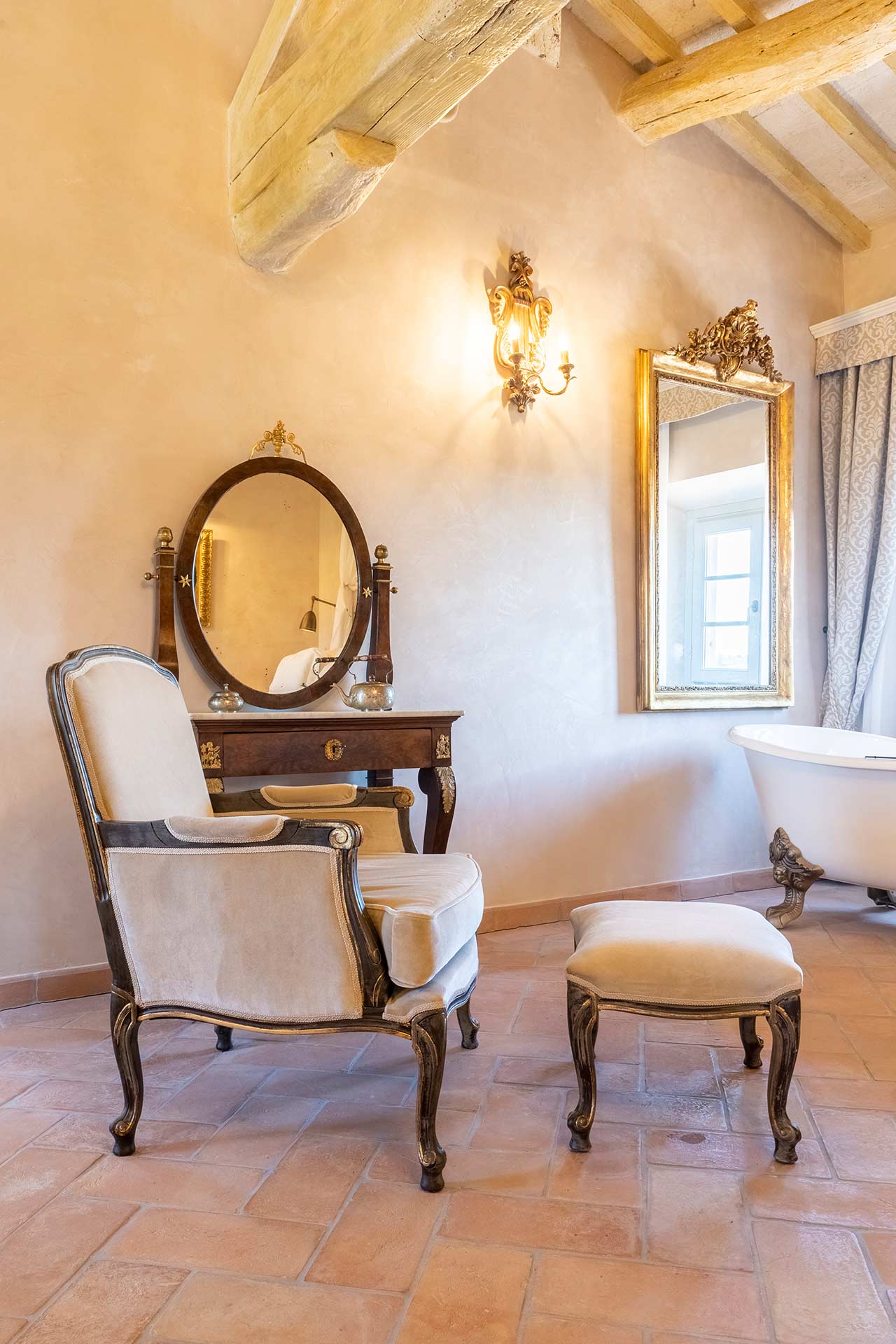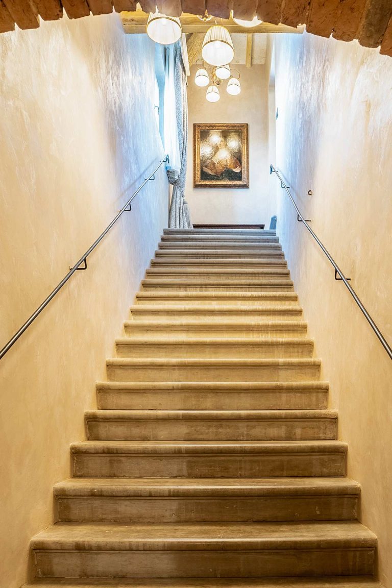 Master Suite “Colombaia” is located on the first floor of the sixteenth-century villa, overlooking two panoramic sides: private entrance with staircase leading to a large sitting room with desk. Beyond the living room, the beautiful bedroom (King Size) and bathtub with lion paws, which overlooks the beautiful swimming pool. Finally a large bright bathroom with large shower.