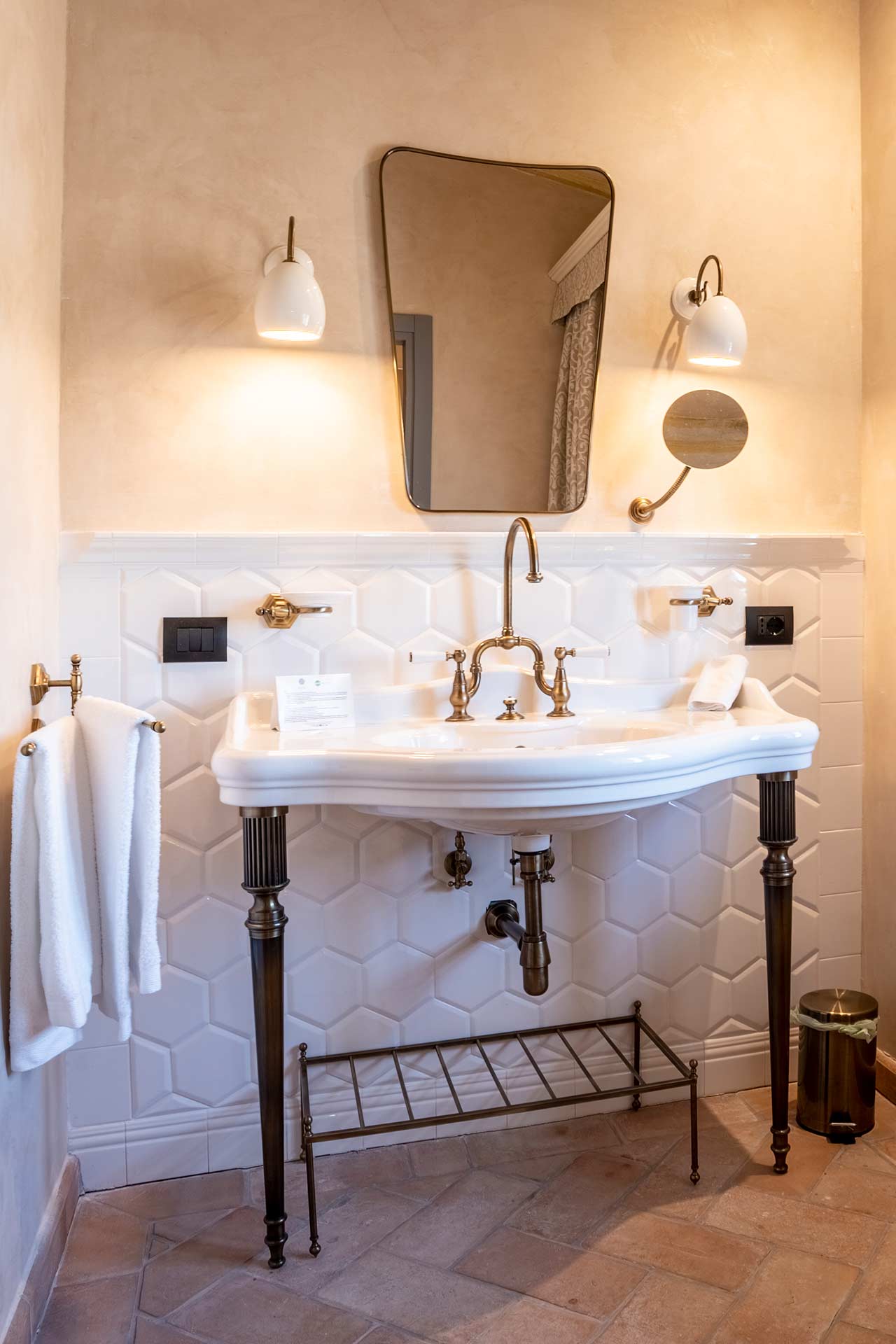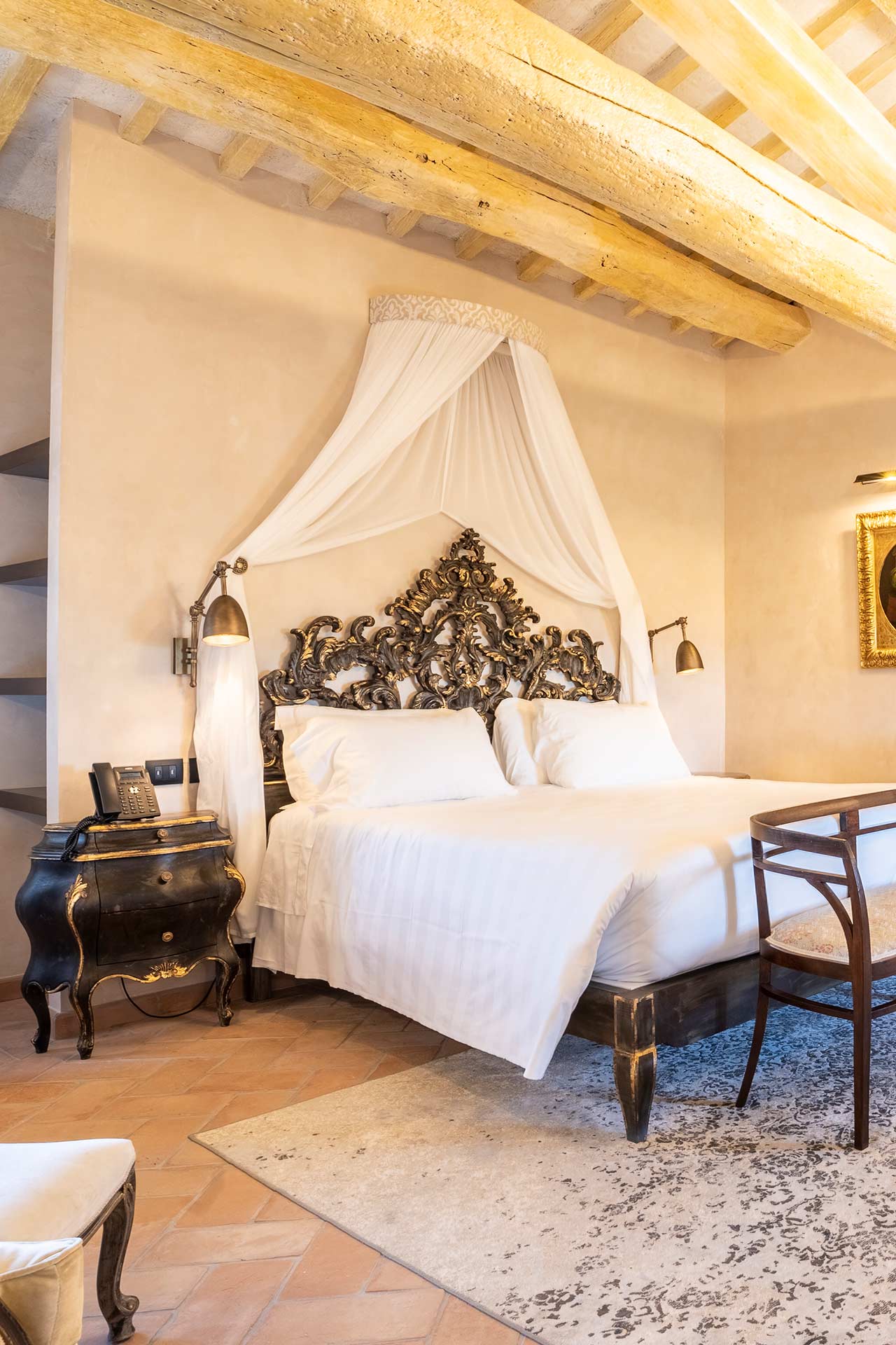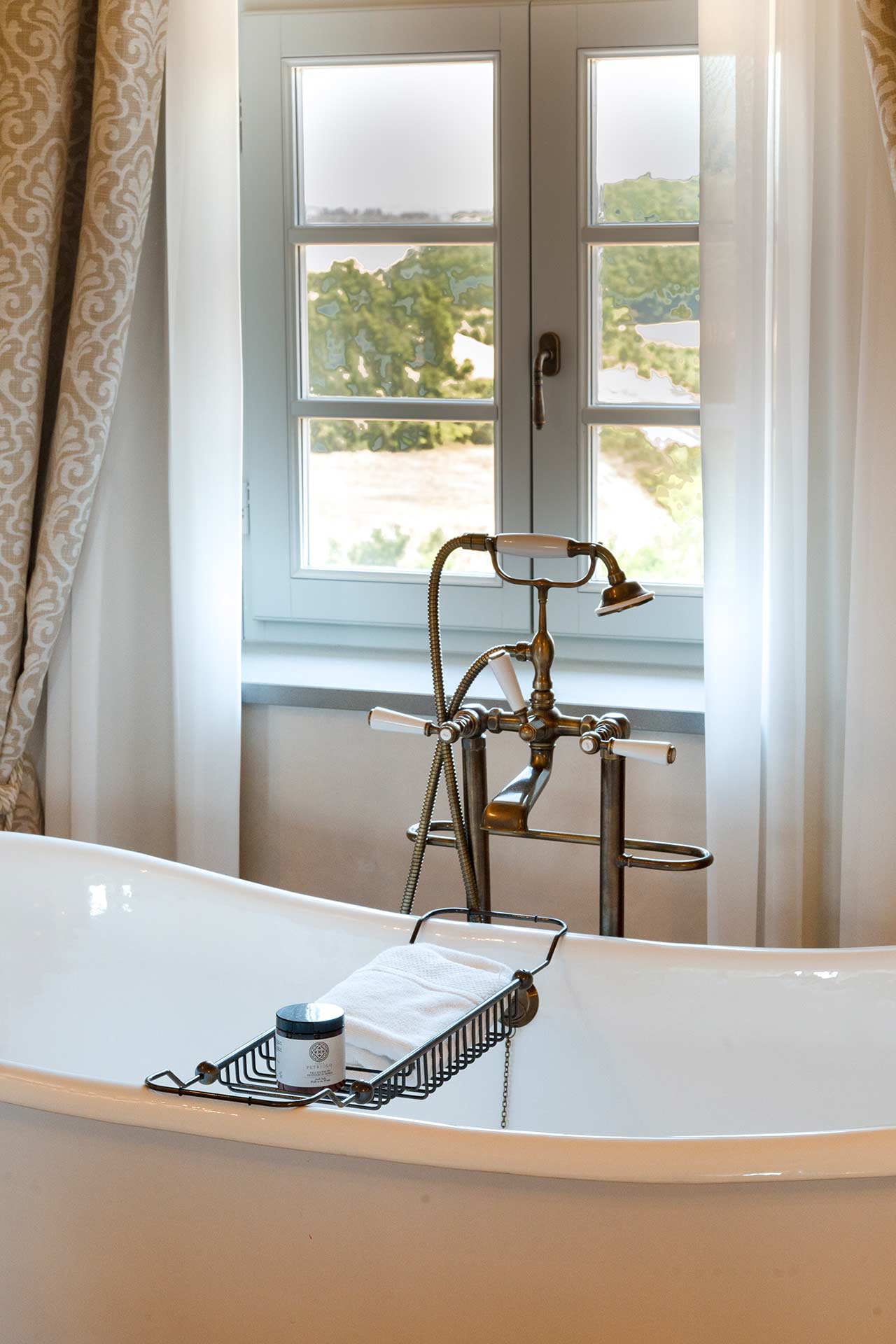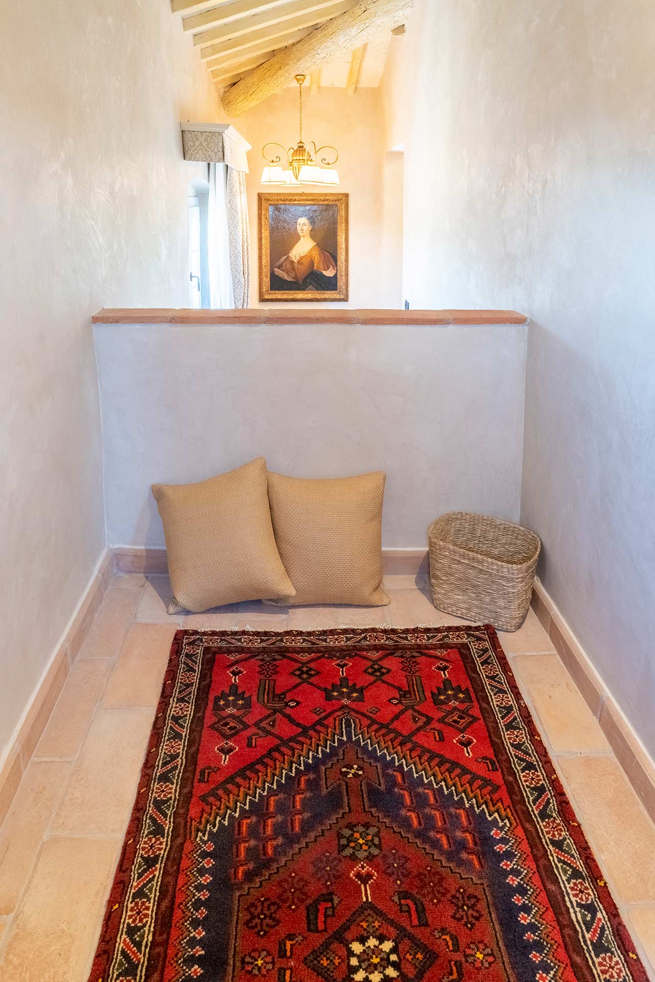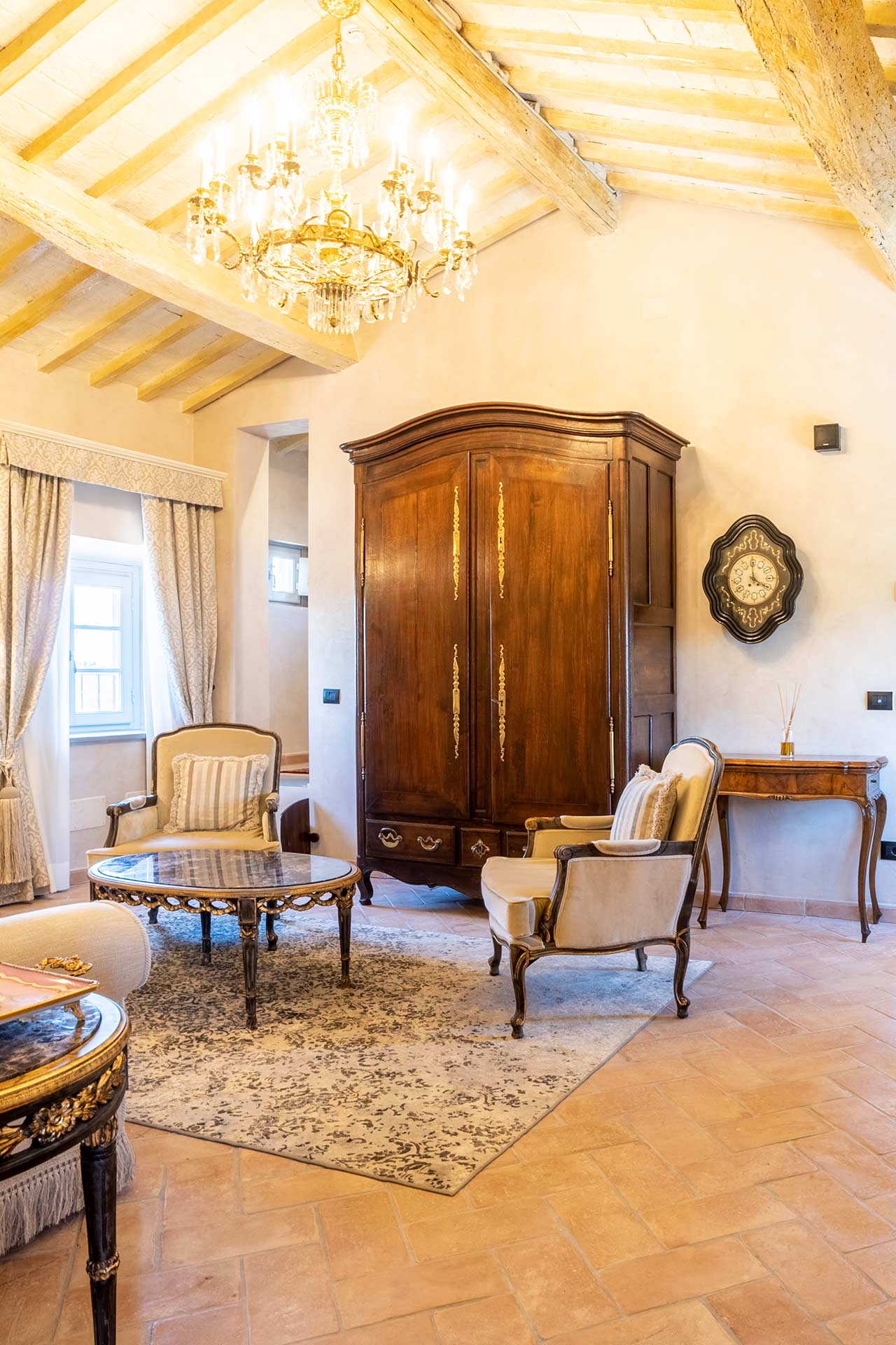 Master Suite “Colombaia” is located on the first floor of the sixteenth-century villa, overlooking two panoramic sides: private entrance with staircase leading to a large sitting room with desk. Beyond the living room, the beautiful bedroom (King Size) and bathtub with lion paws, which overlooks the beautiful swimming pool. Finally a large bright bathroom with large shower.